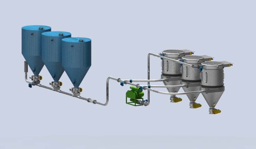 負壓吸送式操作時根本的原則,是要保證在同一網路中的各根輸料管流量的穩定,特別是不能間斷供料。因為一根輸料管斷料,其阻力就隨之大大降低,空氣就會從斷料的管子大量進入,形成這根料管空氣“短路”。此時其余那些正常工作的管子就會因風量減少而掉料。所以,網路中各根輸料管的流量,彼此都應保持一定的比例,不能忽多忽少,更不能突然